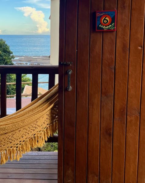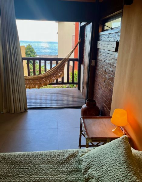 Com aproximadamente 29m², quarto aconchegante com decoraçao estilo Praia , varanda de Madeira com rede, piso porcelanato claro , vista um pouco recuada para o mar e pode acomodar até 3 pessoas. Possui uma cama Queen um sofa de Madeira , mesinha de Centro, Pia com utencilhos e está localizado no segundo pavimento.