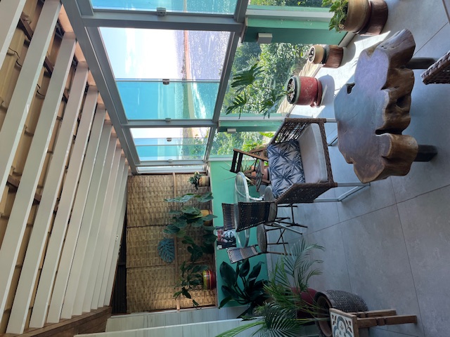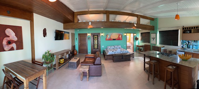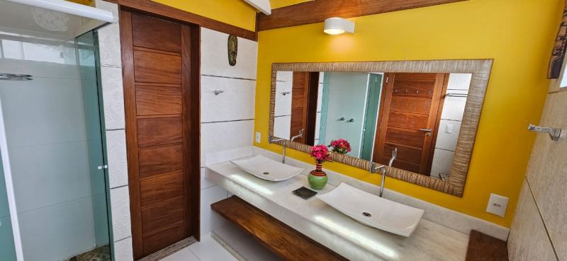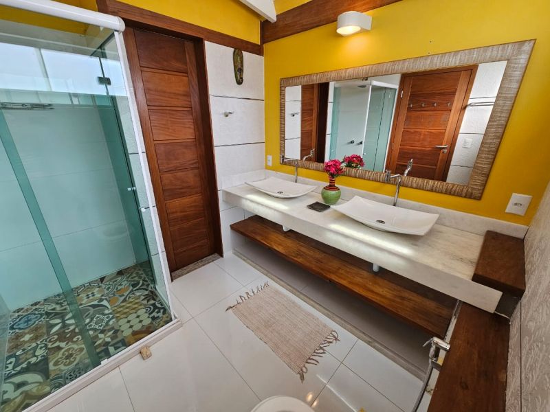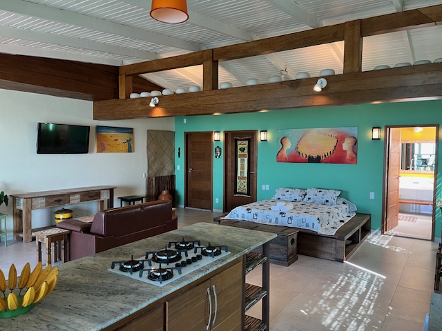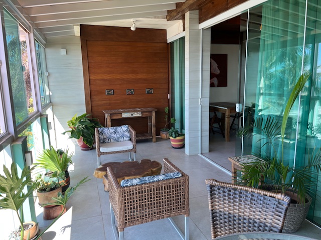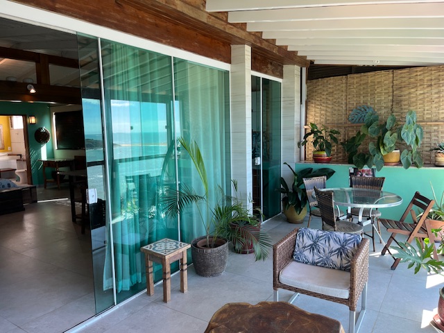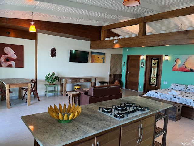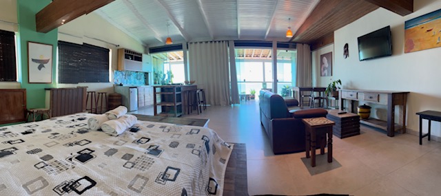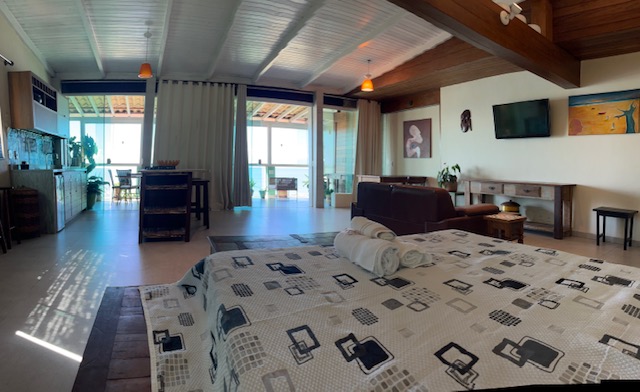 Localizada no Terceiro pavimento com aproximadamente 75m2, Suíte especial com decoração rústica de bom gosto, piso de porcelanato e vários detalhes que enriquecem o ambiente. Varanda grande com mesa cadeiras, poltronas confortáveis e uma linda vista panorâmica para o mar. Espaço com Smart TV e Sofá. Cozinha equipada. Banheiro confortavel com duas pias. Cama Queen size com espaço para três camas de solteiro. Acomoda ate 5 pessoas.